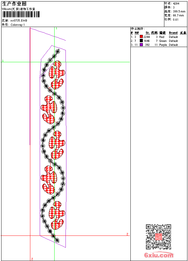 - EMB花版参数: 大小:55.50 KB / 尺寸:67*400[毫米] / 针数:4284针 / 线色:3 / 格式:EMB / 版本:9