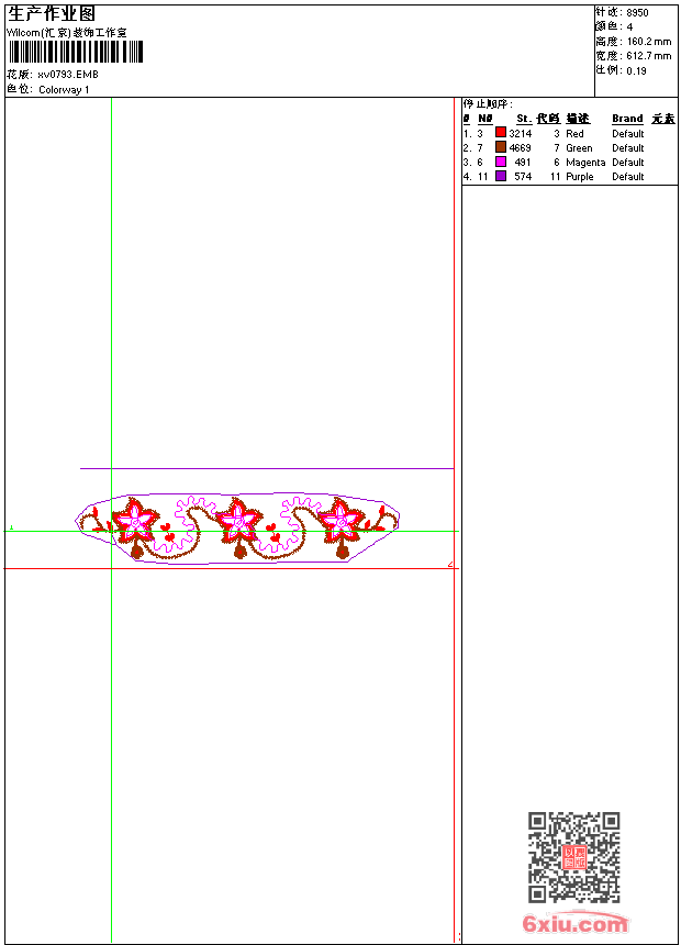 - emb花版参数: 大小:60.00 KB / 尺寸:613*160[毫米] / 针数:8950针 / 线色:4 / 格式:emb / 版本:9