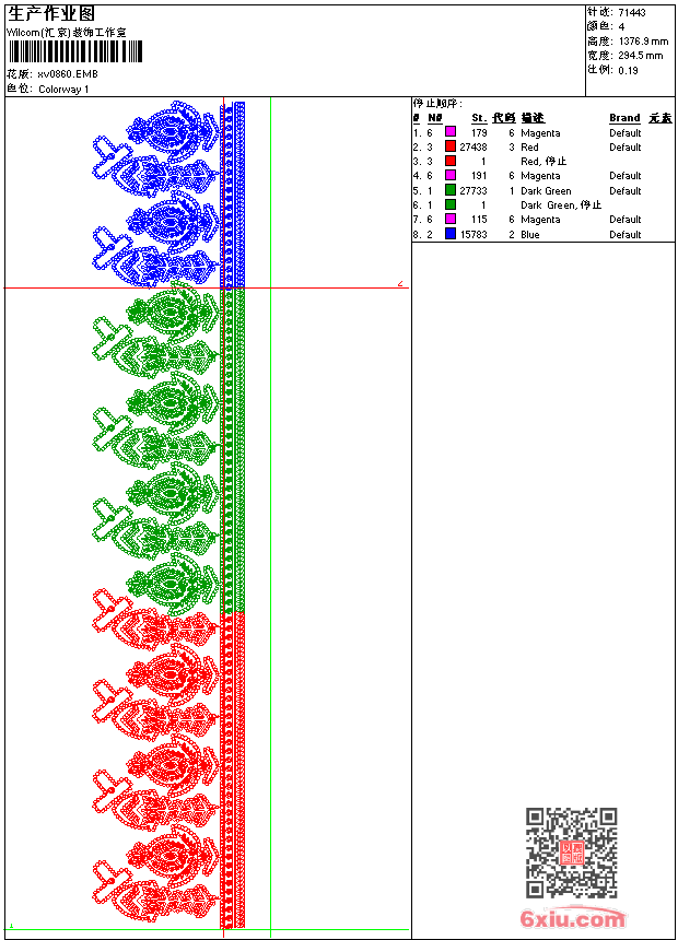 - emb花版参数: 大小:360.50 KB / 尺寸:295*1377[毫米] / 针数:71443针 / 线色:4 / 格式:emb / 版本:9