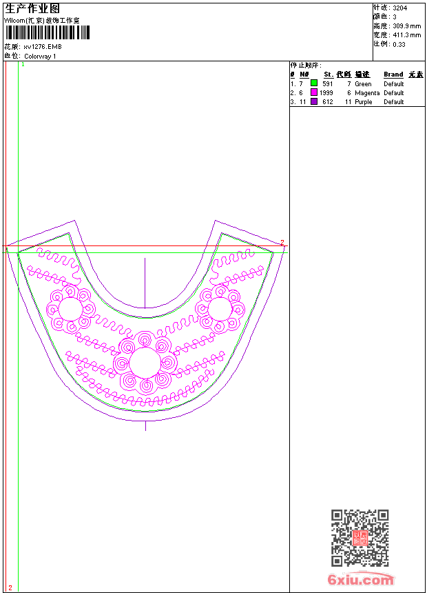 - emb花版参数: 大小:41.50 KB / 尺寸:411*310[毫米] / 针数:3204针 / 线色:3 / 格式:emb / 版本:9