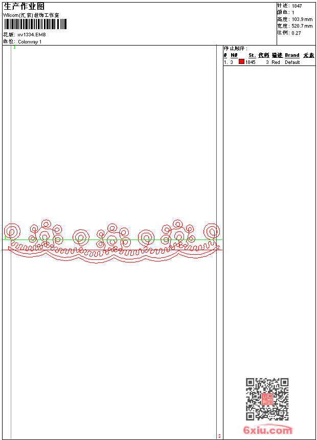 - emb花版参数: 大小:32.00 KB / 尺寸:521*104[毫米] / 针数:1847针 / 线色:1 / 格式:emb / 版本:9