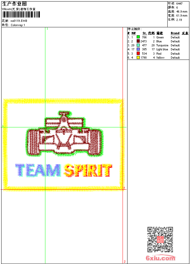 - emb花版参数: 大小:51.50 KB / 尺寸:62*47[毫米] / 针数:6447针 / 线色:6 / 格式:emb / 版本:9