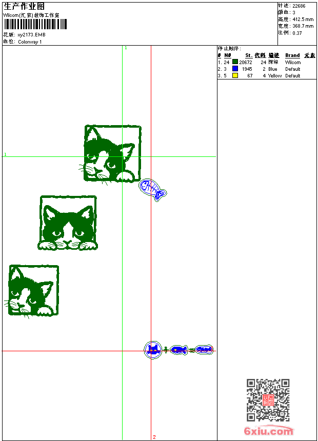 - emb花版参数: 大小:133.00 KB / 尺寸:369*412[毫米] / 针数:22686针 / 线色:3 / 格式:emb / 版本:9