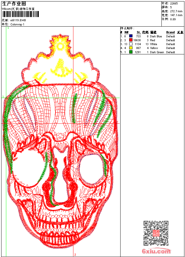 骷髅 点此上传花版兑乐绣币/现金 emb花版参数: 大小:184.00 KB / 尺寸:147*273[毫米] / 针数:22665针 / 线色:5 / 格式:emb / 版本:9 版带文件需绣花软件方可打开,可配色打印导出各种格式或直接上机绣。如无绣花软件可下载1:1模拟效果图。 PNG图片信息:大小:0.7(MB) /图宽*高:557x1032(像素) emb下载 1:1图下载 关闭 相似花版: 狐狸 企鹅 斑马 kenzo 骷髅 米老鼠 中国风燕子靓花 老鹰 丹顶鹤天鹅 欧洲贵妇人头像 英国贵妇人头像 卡通幸福的一家人 手指 领子 翅膀一样的东西 绵阳 卡通树和鸟 兔子 猫头鹰 跳舞的山羊 上一个花样:动物世界鸟瓢虫 下一个花样:狐狸