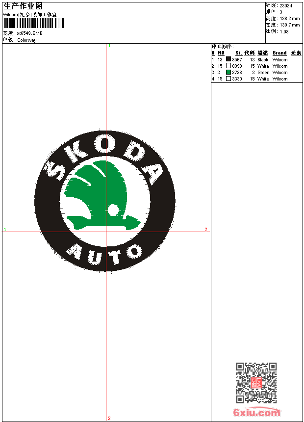 - emb花版参数: 大小:63.00 KB / 尺寸:131*136[毫米] / 针数:23023针 / 线色:3 / 格式:emb / 版本:9