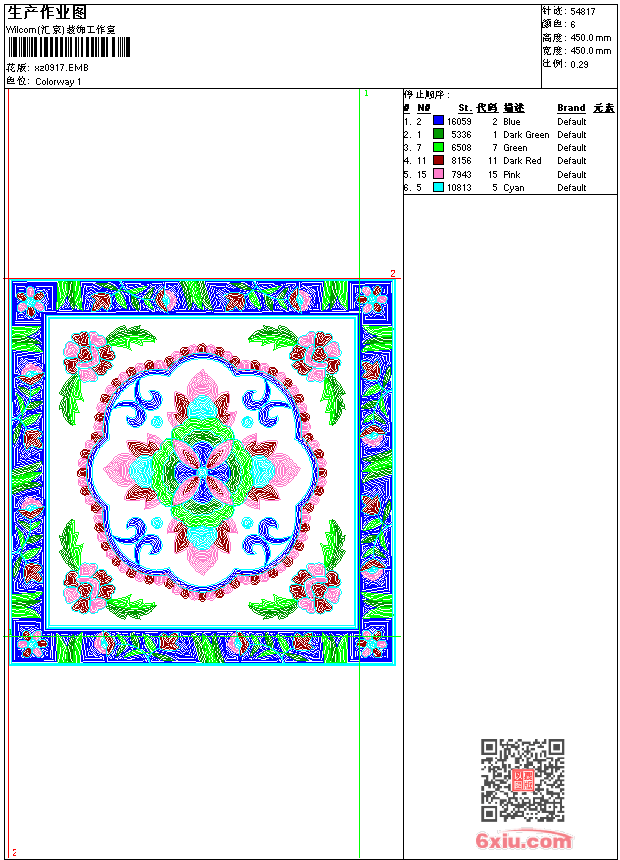 - emb花版参数: 大小:315.50 KB / 尺寸:450*450[毫米] / 针数:54817针 / 线色:6 / 格式:emb / 版本:9