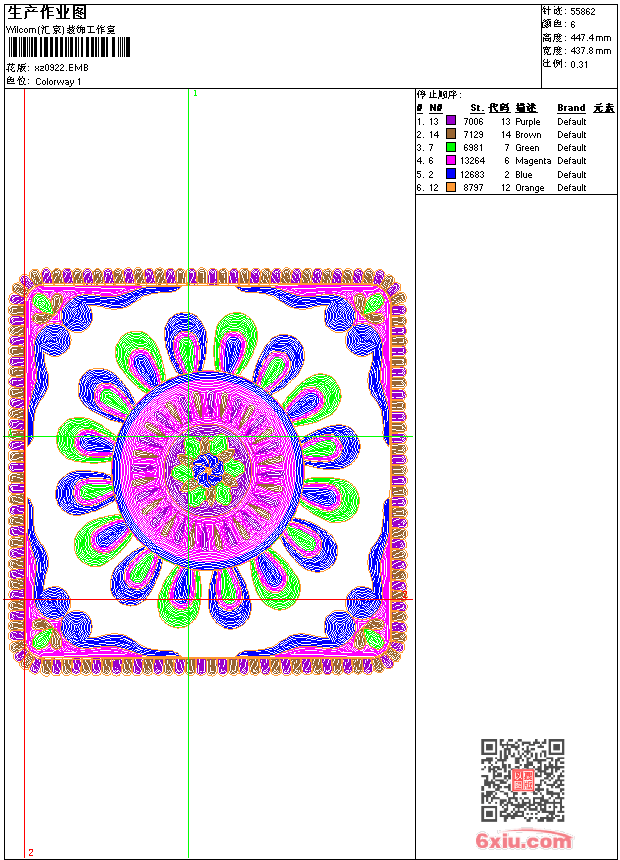 - emb花版参数: 大小:355.50 KB / 尺寸:438*447[毫米] / 针数:55862针 / 线色:6 / 格式:emb / 版本:9