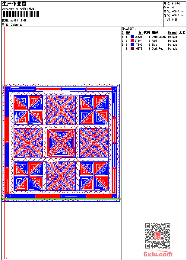 - emb花版参数: 大小:112.00 KB / 尺寸:450*450[毫米] / 针数:64974针 / 线色:4 / 格式:emb / 版本:9