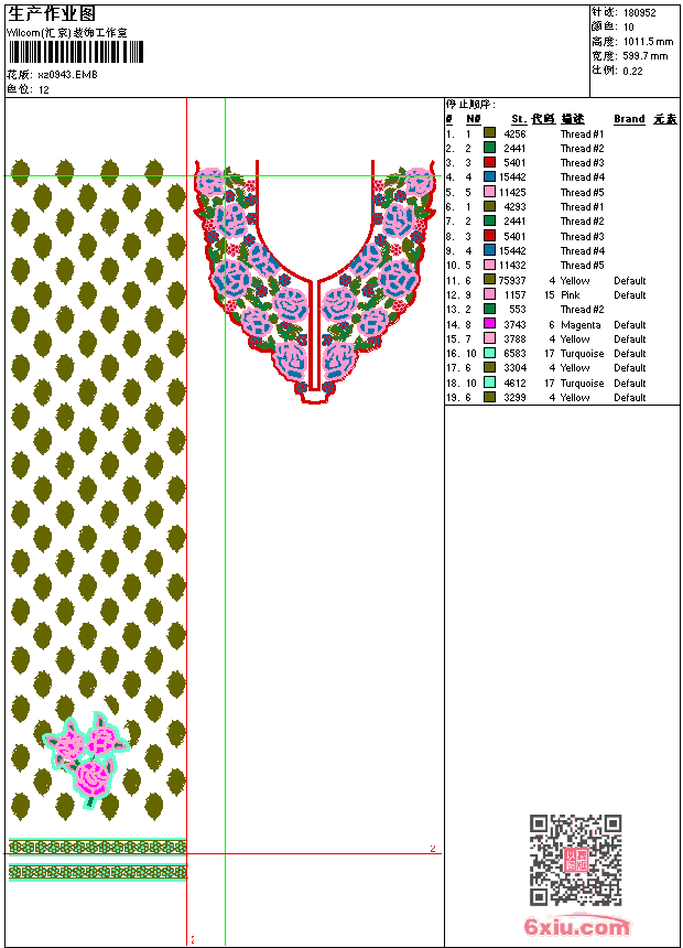 - emb花版参数: 大小:755.50 KB / 尺寸:600*1012[毫米] / 针数:180952针 / 线色:10 / 格式:emb / 版本:9
