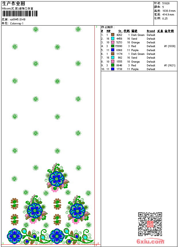 - emb花版参数: 大小:242.50 KB / 尺寸:415*1031[毫米] / 针数:51028针 / 线色:5 / 格式:emb / 版本:9