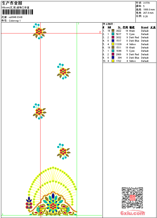 - emb花版参数: 大小:180.50 KB / 尺寸:268*1000[毫米] / 针数:31779针 / 线色:5 / 格式:emb / 版本:9