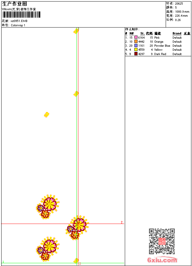 - emb花版参数: 大小:91.50 KB / 尺寸:226*1001[毫米] / 针数:20625针 / 线色:5 / 格式:emb / 版本:9