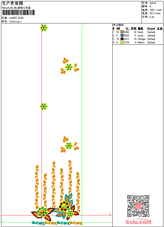- emb花版参数: 大小:94.50 KB / 尺寸:257*1001[毫米] / 针数:20816针 / 线色:4 / 格式:emb / 版本:9