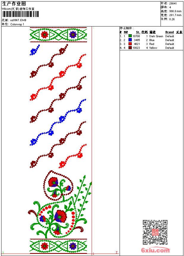 - emb花版参数: 大小:173.00 KB / 尺寸:282*999[毫米] / 针数:29041针 / 线色:4 / 格式:emb / 版本:9