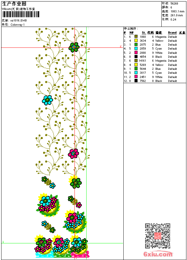 - emb花版参数: 大小:173.00 KB / 尺寸:261*1083[毫米] / 针数:56268针 / 线色:6 / 格式:emb / 版本:9
