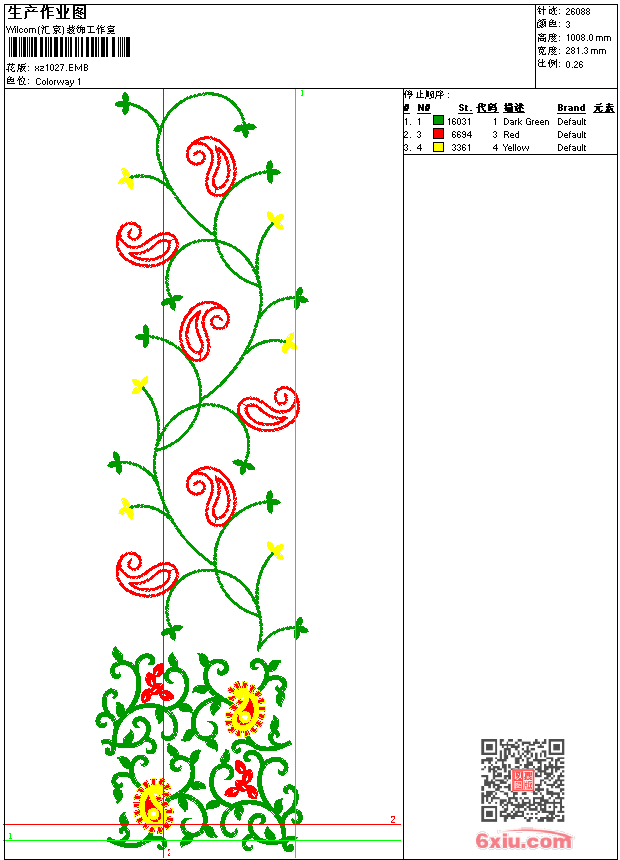 - emb花版参数: 大小:122.00 KB / 尺寸:281*1008[毫米] / 针数:26088针 / 线色:3 / 格式:emb / 版本:9