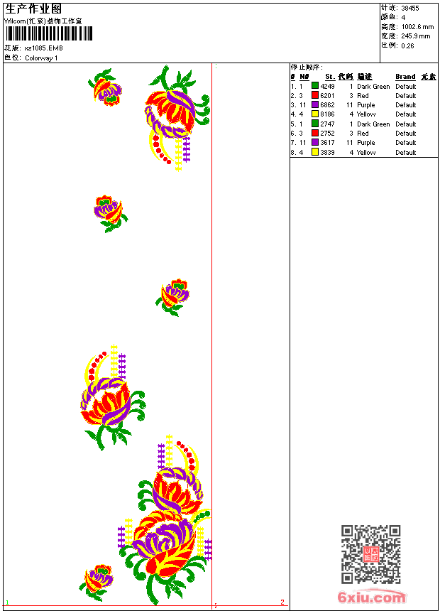 - emb花版参数: 大小:186.00 KB / 尺寸:246*1003[毫米] / 针数:38455针 / 线色:4 / 格式:emb / 版本:9