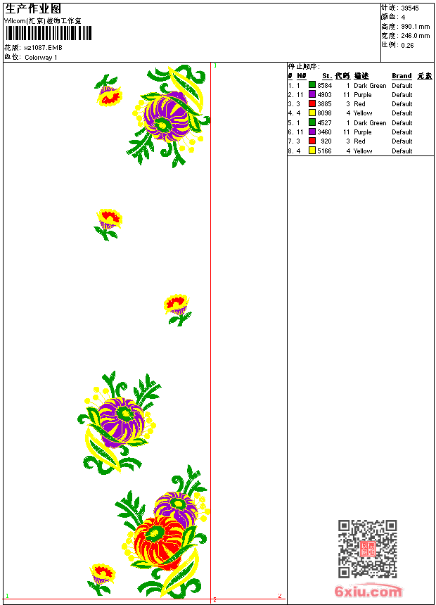 - emb花版参数: 大小:190.50 KB / 尺寸:246*990[毫米] / 针数:39545针 / 线色:4 / 格式:emb / 版本:9