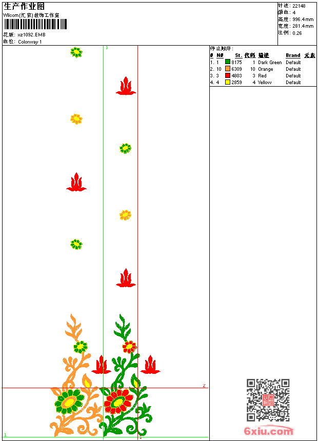- emb花版参数: 大小:66.00 KB / 尺寸:281*996[毫米] / 针数:22148针 / 线色:4 / 格式:emb / 版本:9