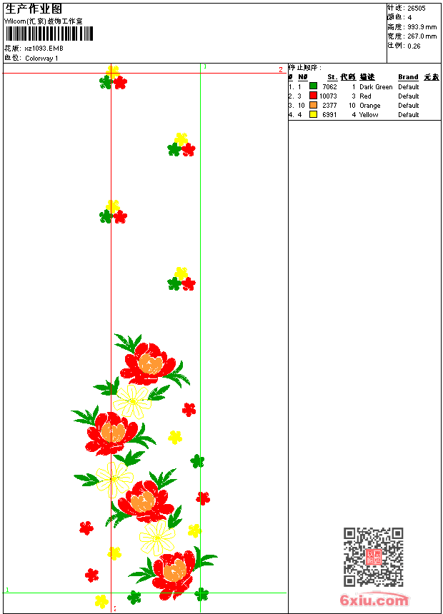 - emb花版参数: 大小:107.00 KB / 尺寸:267*994[毫米] / 针数:26505针 / 线色:4 / 格式:emb / 版本:9