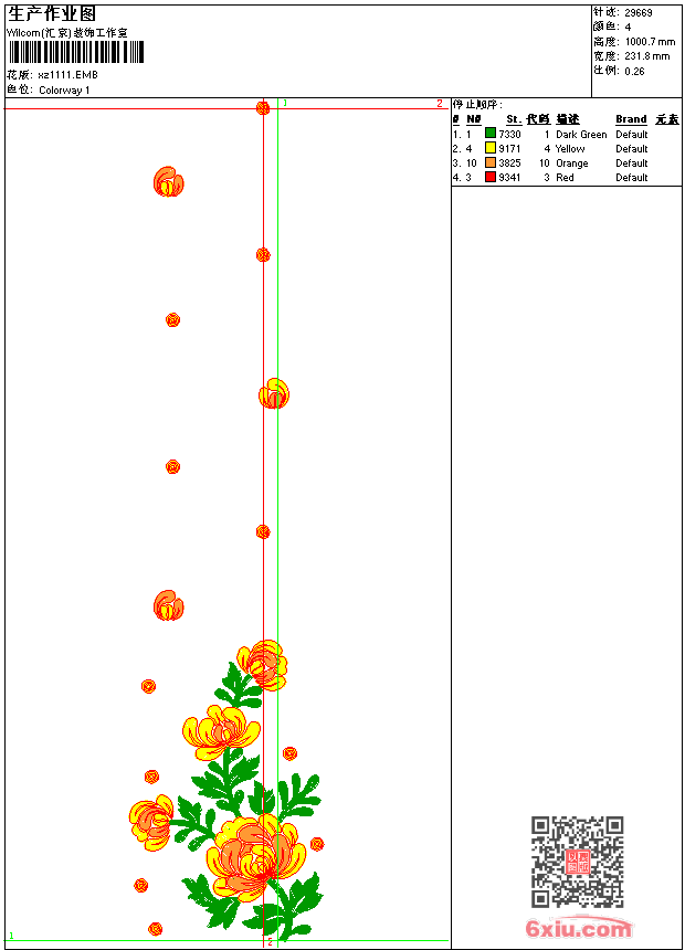 - emb花版参数: 大小:102.00 KB / 尺寸:232*1001[毫米] / 针数:29669针 / 线色:4 / 格式:emb / 版本:9