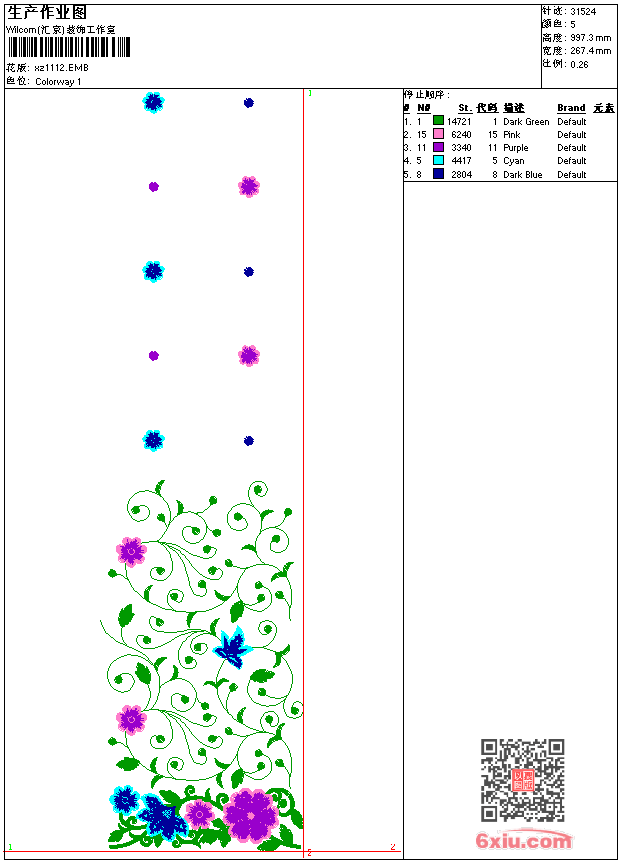 - emb花版参数: 大小:168.00 KB / 尺寸:267*997[毫米] / 针数:31523针 / 线色:5 / 格式:emb / 版本:9