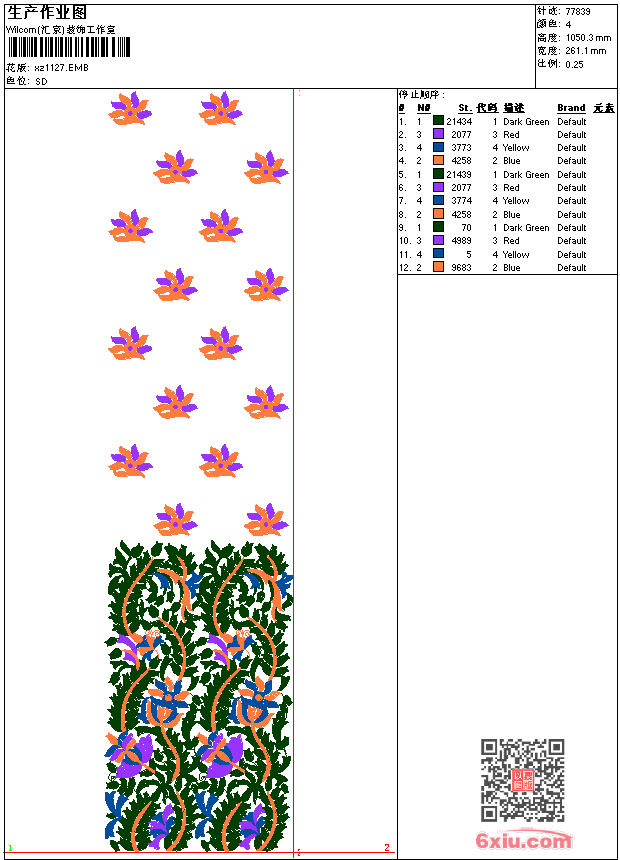 - emb花版参数: 大小:1.58 MB / 尺寸:261*1050[毫米] / 针数:77839针 / 线色:4 / 格式:emb / 版本:9