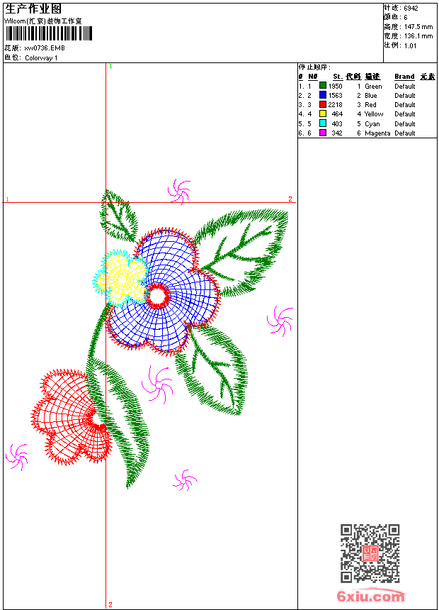- emb花版参数: 大小:55.00 KB / 尺寸:136*148[毫米] / 针数:6942针 / 线色:6 / 格式:emb / 版本:9