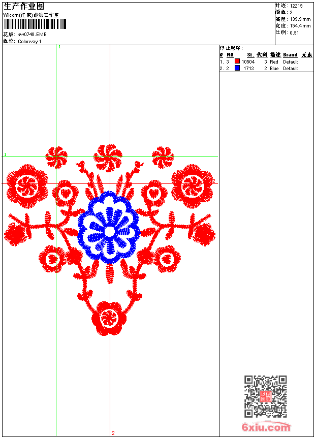- emb花版参数: 大小:80.00 KB / 尺寸:154*140[毫米] / 针数:12219针 / 线色:2 / 格式:emb / 版本:9