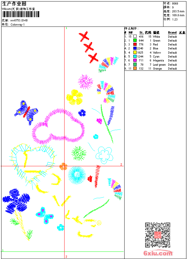 - emb花版参数: 大小:81.00 KB / 尺寸:110*204[毫米] / 针数:8068针 / 线色:9 / 格式:emb / 版本:9