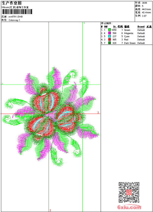 - emb花版参数: 大小:44.50 KB / 尺寸:43*45[毫米] / 针数:3699针 / 线色:5 / 格式:emb / 版本:9