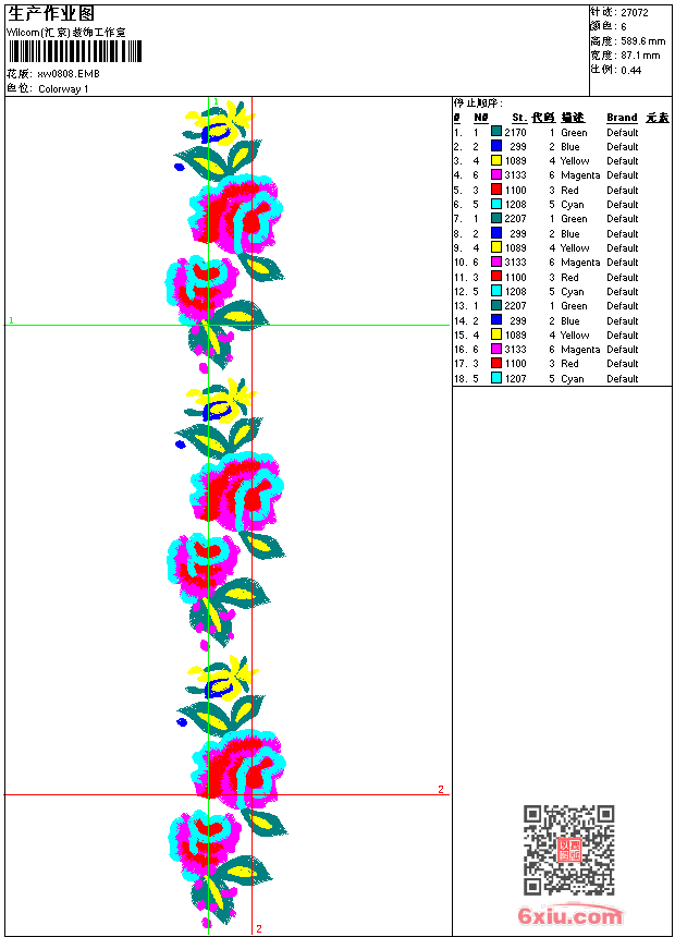 - emb花版参数: 大小:125.50 KB / 尺寸:87*590[毫米] / 针数:27072针 / 线色:6 / 格式:emb / 版本:9