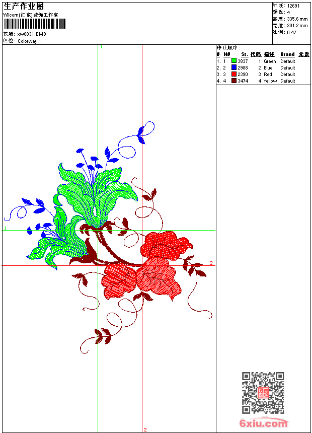- emb花版参数: 大小:50.00 KB / 尺寸:301*336[毫米] / 针数:12691针 / 线色:4 / 格式:emb / 版本:9