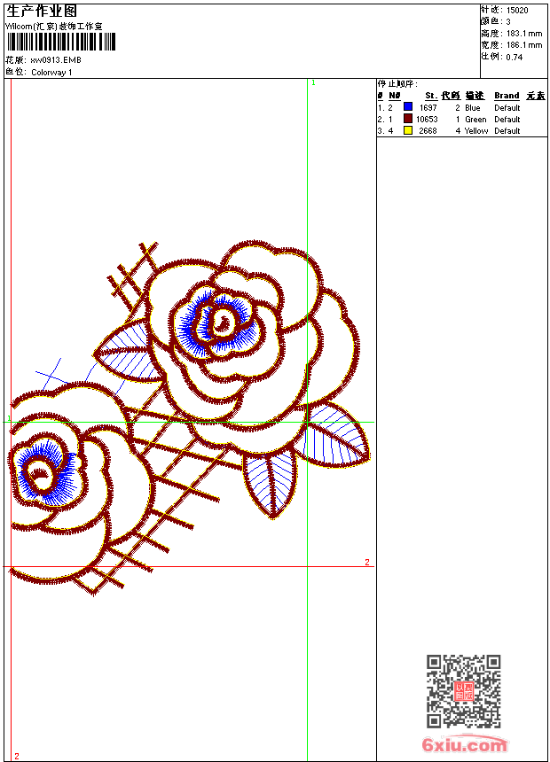 - emb花版参数: 大小:128.50 KB / 尺寸:186*183[毫米] / 针数:15020针 / 线色:3 / 格式:emb / 版本:9
