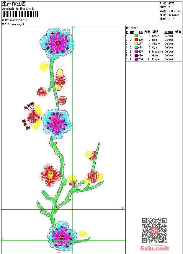 • emb花版参数: 大小:51.00 KB / 尺寸:48*131[毫米] / 针数:4077针 / 线色:7 / 格式:emb / 版本:9