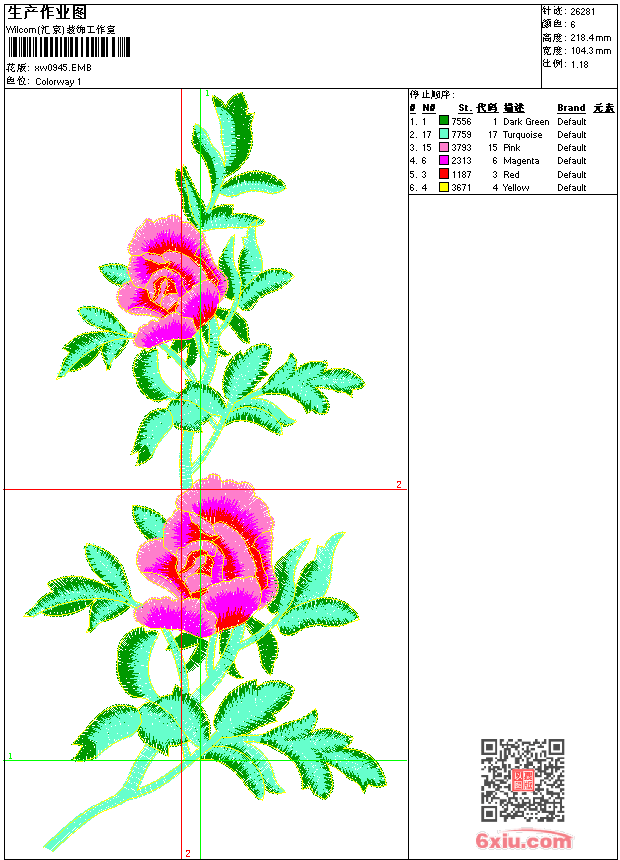 - emb花版参数: 大小:145.50 KB / 尺寸:104*218[毫米] / 针数:26281针 / 线色:6 / 格式:emb / 版本:9