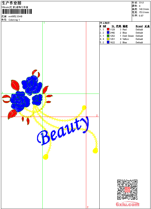 - emb花版参数: 大小:64.00 KB / 尺寸:153*144[毫米] / 针数:7717针 / 线色:4 / 格式:emb / 版本:9