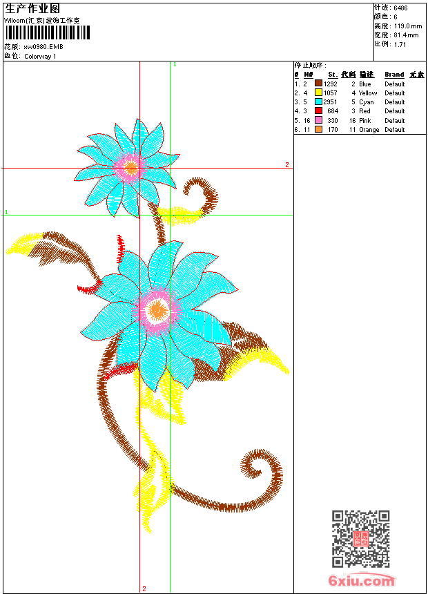 - emb花版参数: 大小:54.50 KB / 尺寸:81*119[毫米] / 针数:6486针 / 线色:6 / 格式:emb / 版本:9