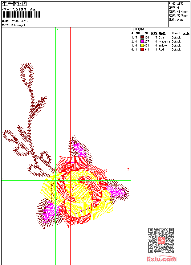 - emb花版参数: 大小:36.00 KB / 尺寸:51*67[毫米] / 针数:2657针 / 线色:4 / 格式:emb / 版本:9