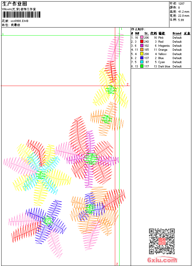 - emb花版参数: 大小:31.50 KB / 尺寸:23*41[毫米] / 针数:1287针 / 线色:8 / 格式:emb / 版本:9