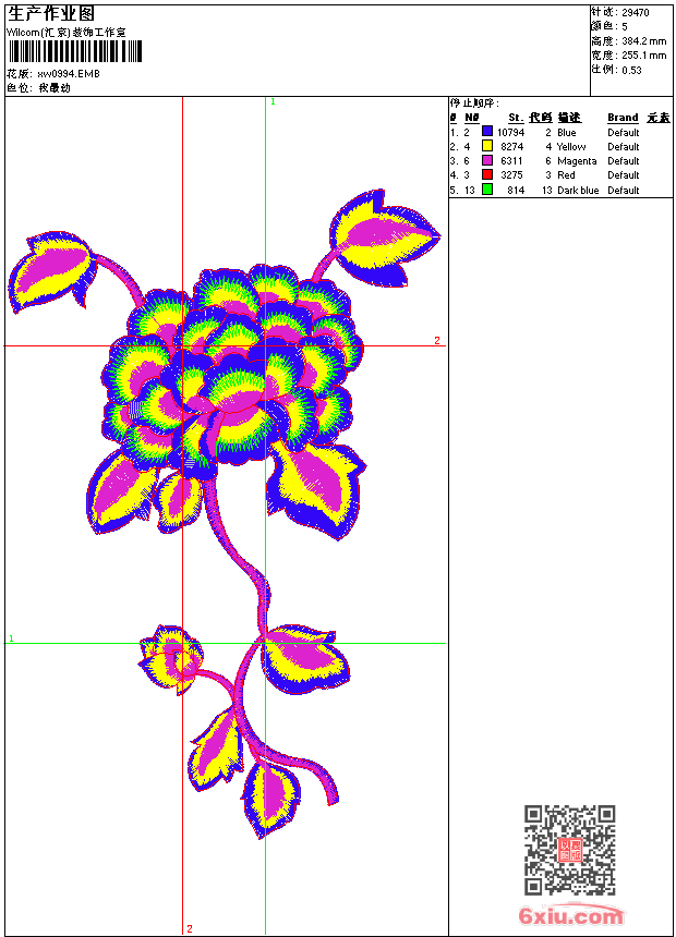 - emb花版参数: 大小:178.00 KB / 尺寸:255*384[毫米] / 针数:29470针 / 线色:5 / 格式:emb / 版本:9