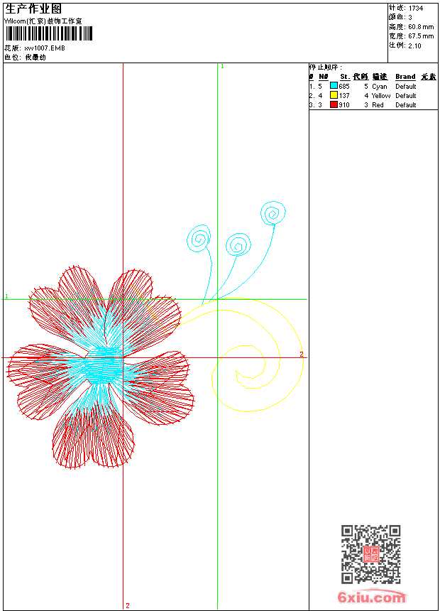 - emb花版参数: 大小:27.50 KB / 尺寸:68*61[毫米] / 针数:1734针 / 线色:3 / 格式:emb / 版本:9