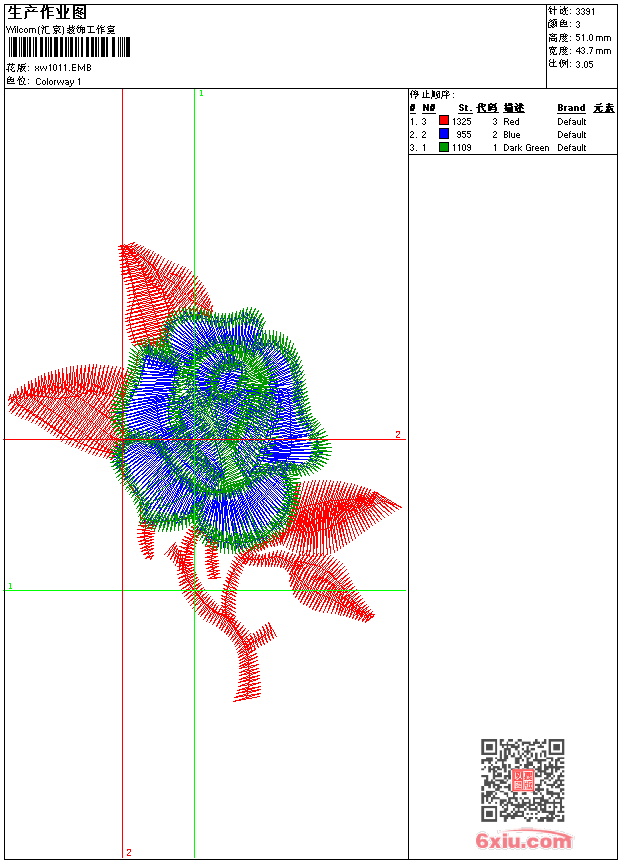 - emb花版参数: 大小:34.50 KB / 尺寸:44*51[毫米] / 针数:3391针 / 线色:3 / 格式:emb / 版本:9