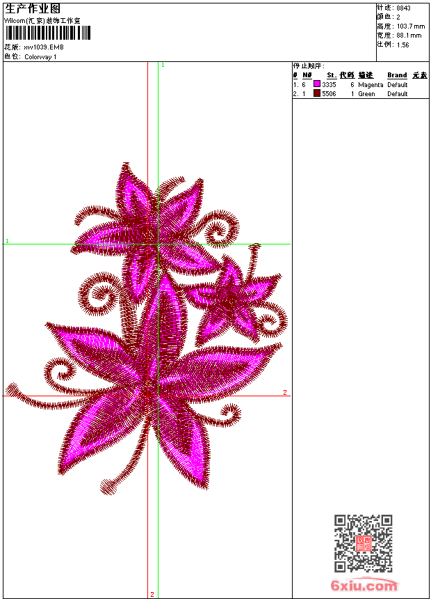 - emb花版参数: 大小:67.00 KB / 尺寸:88*104[毫米] / 针数:8843针 / 线色:2 / 格式:emb / 版本:9