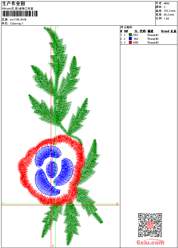 - emb花版参数: 大小:31.00 KB / 尺寸:60*153[毫米] / 针数:4682针 / 线色:3 / 格式:emb / 版本:9