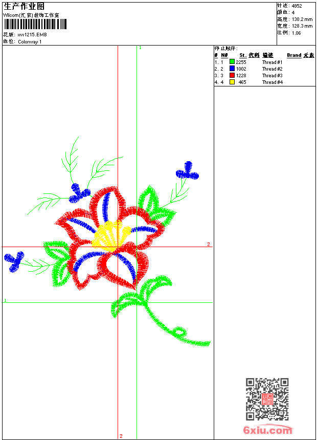 - emb花版参数: 大小:33.50 KB / 尺寸:128*130[毫米] / 针数:4952针 / 线色:4 / 格式:emb / 版本:9