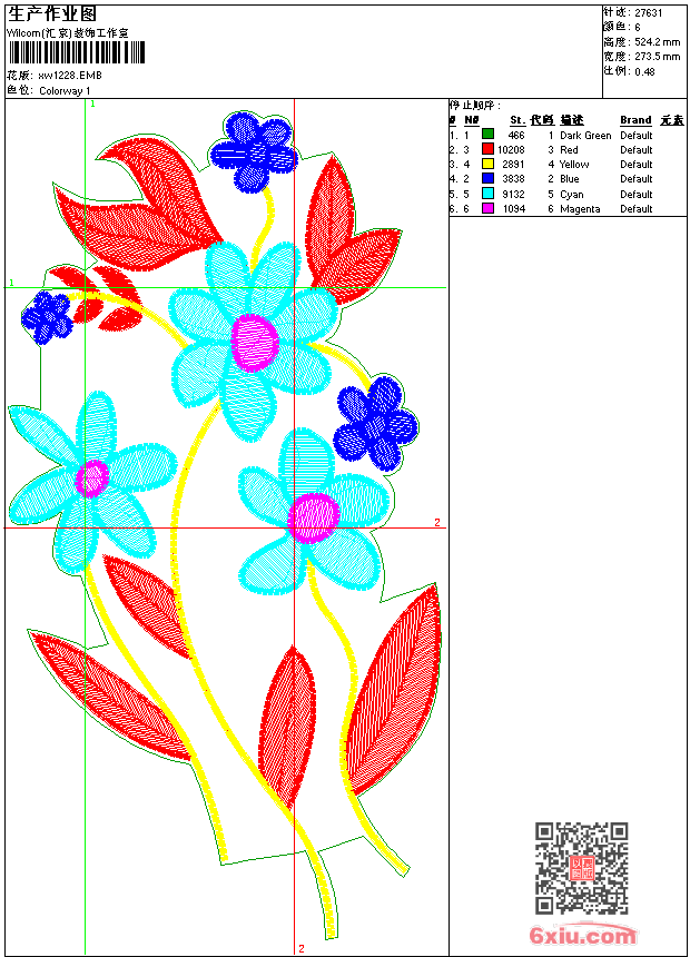- emb花版参数: 大小:170.00 KB / 尺寸:273*524[毫米] / 针数:27631针 / 线色:6 / 格式:emb / 版本:9