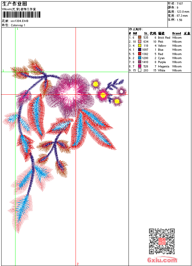 - emb花版参数: 大小:65.50 KB / 尺寸:87*123[毫米] / 针数:7107针 / 线色:9 / 格式:emb / 版本:9