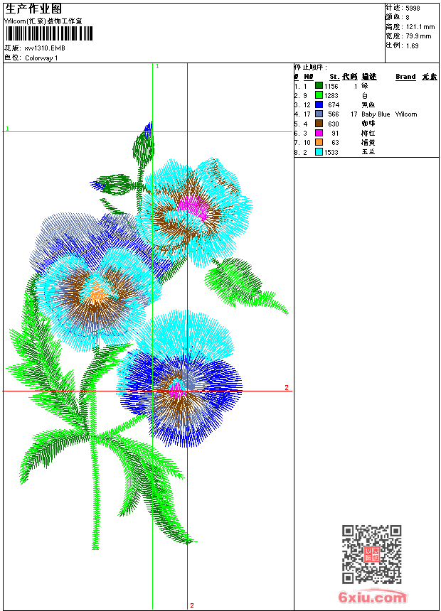 - emb花版参数: 大小:57.50 KB / 尺寸:80*121[毫米] / 针数:5998针 / 线色:8 / 格式:emb / 版本:9