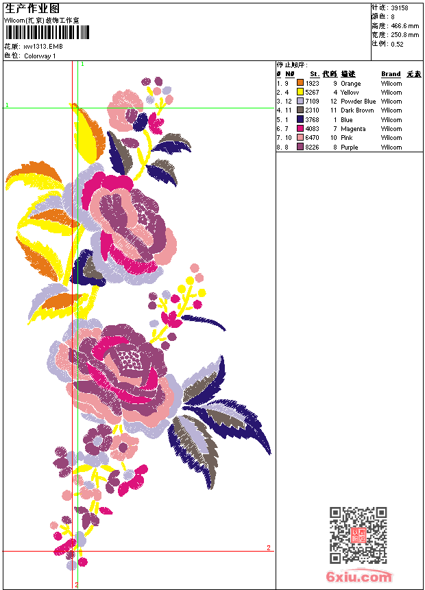 - emb花版参数: 大小:196.50 KB / 尺寸:251*467[毫米] / 针数:39158针 / 线色:8 / 格式:emb / 版本:9